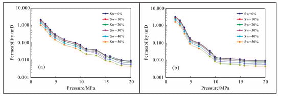 Variation characteristics of overburden permeability of shale with different water saturation. (a) is clay shale, (b) is silty shale. With the increase in water saturation, the permeability of shale decreases gradually. As the pressure increases, the permeability of the shale gradually decreases.