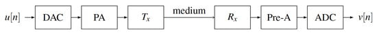 The system used in this study for sonar detection can be illustrated by the diagram in Figure 3. To start, a digital pulse is generated and then directed into the digital-to-analogue converter (DAC). The analogue signal is then amplified by the power amplifier (PA) before being transmitted through the medium by the transmitter (). As the pulse travels through the medium, it reflects and returns to the receiver (), where it is acquired and amplified by the pre-amplifier (Pre-A) and converted into digital format by the analogue-to-digital converter (ADC).