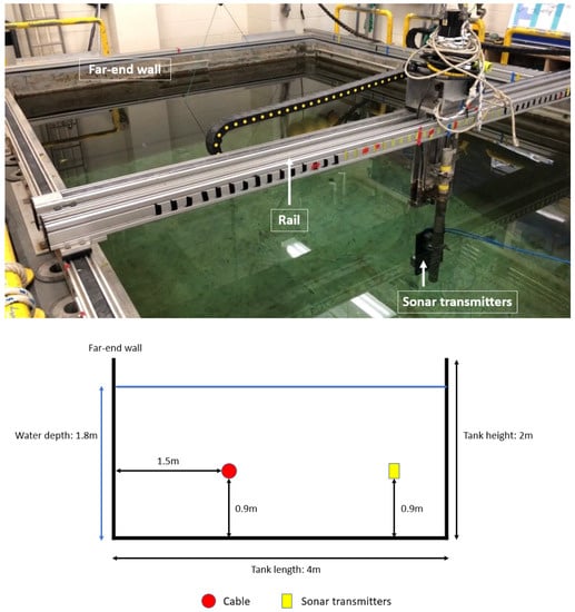 In our experiment, the cables are placed in a water tank and scanned under various experimental settings. Specifically, we employ a water tank of dimension: 3 m × 4 m × 2 m with water depth of 1.8 m. Sonar transmitters are mounted on rail with the midline of the transmitter is at approximately 0.9 m depth (Figure 5). The cables are suspended in the water using weight at 1.5 m from the far wall of the tank, and placed in front of the sonar’s transducer with cable midline at 0.9 m depth to coincide with the acoustic centres for the transducer array.