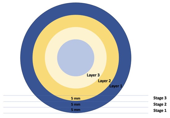 Specifically, we induce controlled abrasion using a grinder on our subsea cable samples. To obtain sufficient integrity data of different levels of degradation, we abrade the outer layers of the cable at three levels. At each level, the top part of the outer armour layer is reduced by 5 mm (as shown in Figure 6).
