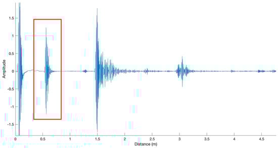 In this study, the sampling rate is 1 MHz during the echo data acquisition, which means 1,000,000 samples per second on each channel for one ping. After each ping, the sonar records 100,000 samples at MHz, so each recorded ping is 100 ms (0.1 s) long. When scanning an object in a water tank, the original recorded echo response will contain number of reflections, including reflection from the target, walls, bottom of the tank and other surfaces (Figure 7). The horizontal axis of Figure 7 is distance, measured in metres. This is computed by multiplying the speed of sonar echo response travelling underwater by the time elapsed until receiving signal. This distance maps the different distances where cables are placed in the experiment water tank.