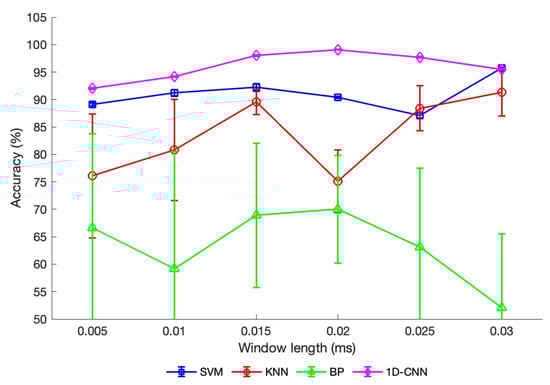 In addition, we also aim to explore the optimal range for the size of the data segment, commonly referred to as the window length. This exploration provides valuable insights for future research, as it helps researchers make informed decisions regarding the choice of window length. In Figure 8, the horizontal axis is the window length in milliseconds and vertical axis the accuracy rate of the algorithm. We observe that the best-performing classifier 1D-CNN demonstrates superior performance within specific window lengths (specifically, from 0.015 ms to 0.025 ms) compared to other window lengths.