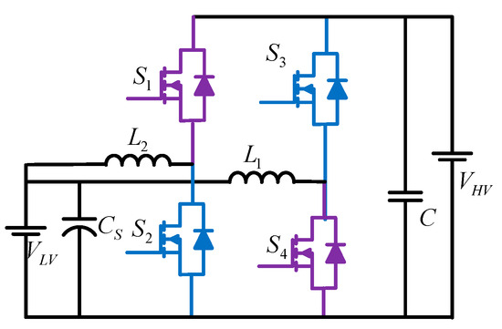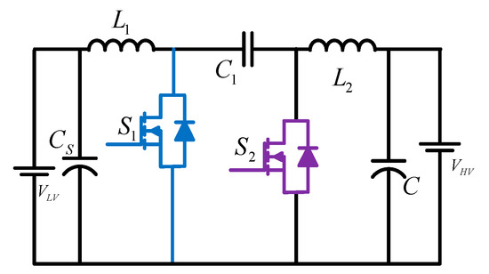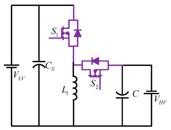 As shown in Figure 1, the basic BDC is implemented by using the concept of the buck and boost converter. The improvement in the buck and boost converter has truly realized this bidirectional structure. In other words, if the basic buck and boost converter’s unidirectional switches are replaced with bidirectional power switches, a bidirectional buck–boost converter can be created. When converting voltage from low level to high level, this converter operates in boost mode, and from high level to low level in buck mode.
