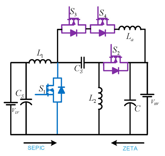 - Kim, I.-D.; Paeng, S.-H.; Ahn, J.-W.; Nho, E.-C.; Ko, J.-S. New Bidirectional ZVS PWM Sepic/Zeta DC-DC Converter. In Proceedings of the 2007 IEEE International Symposium on Industrial Electronics, Vigo, Spain, 4–7 June 2007; pp. 555–560. [Google Scholar] [CrossRef]