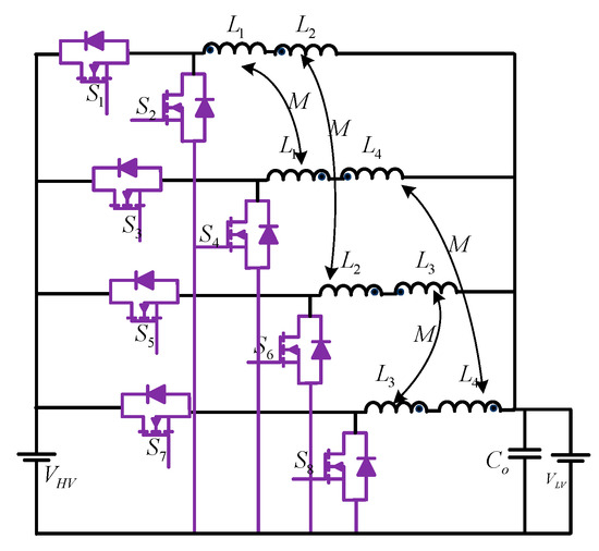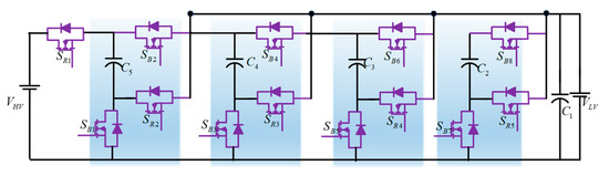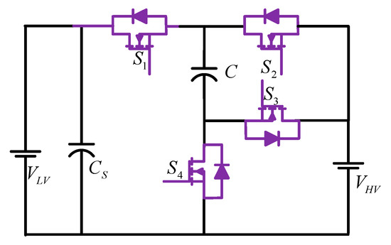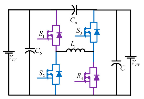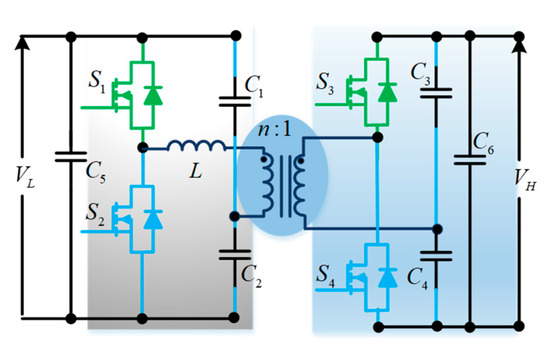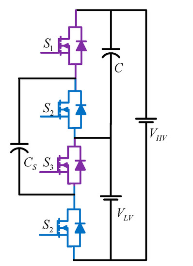 For the application of dual voltage (42/14 Volt) automotive systems, an efficient, compact, and magnetic-less BDC is reported, as shown in Figure 11 [21]. This topology utilizes a flying capacitor (FC)-based four-level BDC, which comprises six switching cells and three switching poles. Due to the typical multilevel converter configuration, this DC-DC converter offers several advantages, such as the capability of accommodating various voltage levels of the battery, less EMI (electromagnetic interference), and low price due to utilizing low-voltage MOSFETs.