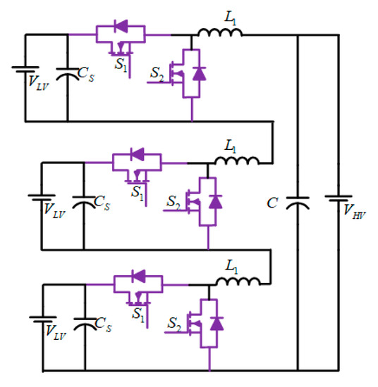 The circuit illustrated in Figure 10 represents a multilevel BDC. In this circuit, each level has a switching module, which is utilized as a repeating pattern to offer high voltage gain. In dual-voltage automotive systems, multilevel BDC can be employed. The weight and size of the converter are significantly decreased since there are no magnetic elements.
