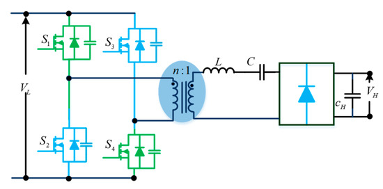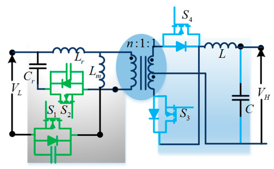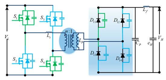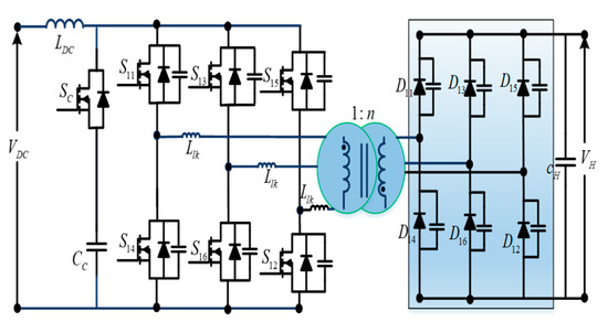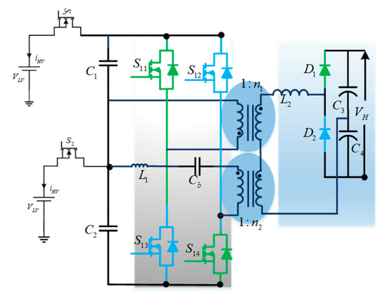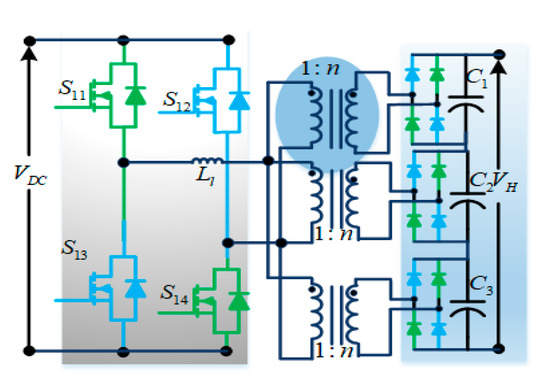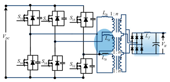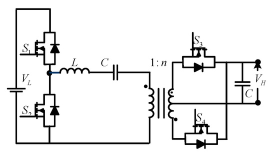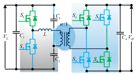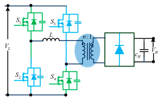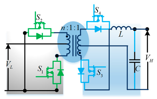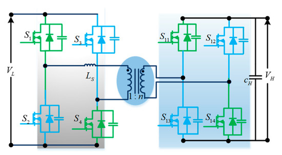 A bidirectional push–pull converter (Figure 15) is proposed based on a unidirectional push–pull converter to allow bidirectional power flow. Similar to unidirectional push–pull converters, these bidirectional push–pull converters use a multi-winding transformer to transfer power from the source to the load. The study in [32] proposes a three-phase bidirectional push–pull converter to improve the power-handling capability for high-power applications.