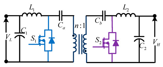 - Ruseler, A.; Barbi, I. Isolated Zeta-SEPIC bidirectional dc-dc converter with active-clamping. In Proceedings of the 2013 Brazilian Power Electronics Conference, Gramado, Brazil, 27–31 October 2013; pp. 123–128. [Google Scholar] [CrossRef]