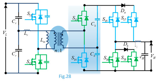 As shown in Figure 16, in consideration of the unidirectional forward converter, the bidirectional forward converter could be recommended. To achieve zero-voltage switching, a clamped circuit can be employed in this converter. In [34], the investigation on the bidirectional forward DC-DC converter is proposed as a resonant version by utilizing the leakage inductance of the transformer utilized as a resonant inductor. Depending on the required load demands and characteristics, various combinations of previously mentioned topologies, such as Push–Pull–Forward [35], Flyback–Push–Pull [36], and Forward–Flyback [37], are proposed as hybrid setups. The transformer’s primary side in these converters can be derived from any one of the discussed isolated topologies, and the secondary side is from either voltage-fed or current-fed.