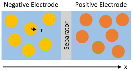 The structure of a battery under the P2D model configuration is displayed in Figure 1. The cell consists of three regions: the positive electrode, the separator, and the negative electrode. The active materials are modeled as spherical particles that fill in the positive and negative electrodes. Two dimensions are considered in the P2D model. The x-axis is defined in the direction perpendicular to these layers to account for the diffusion and migration of Li ions in the liquid phase. The origin of the r-axis is at the center of the solid sphere, which describes the diffusion of Li ions in the active materials.