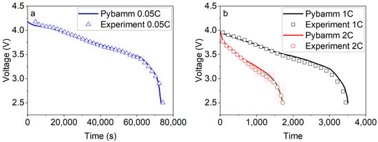 To validate the proposed calculation method, we have conducted simulations using the LG M50 cylindrical cell. The detailed values of battery parameters were taken from the reported works [52,56]. To represent different operating conditions, three distinct discharging rates were selected, which are 0.05C, 1C, and 2C. The voltage responses obtained from our model, which was implemented using PyBaMM v23.5, were compared with experimental data available online and depicted in Figure 3. Due to the significant difference in discharging timespans between 0.05C and the other rates, their responses were plotted separately in Figure 3a. The model exhibited good agreement with the experimental data for the discharging curve. Minor deviations between simulation results and experimental data were observed for higher discharging rates, i.e., 1C and 2C in Figure 3b, yet remained within acceptable tolerances.