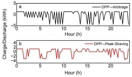 (a) Charge and discharge energy (kWh) for arbitrage against DPP tariff; (b) charge and discharge energy (kWh) for peak shaving against DPP tariff.
