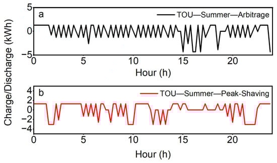 (a) Charge and discharge energy (kWh) for arbitrage against TOU tariff (summer); (b) charge and discharge energy (kWh) for peak shaving against TOU tariff (summer).