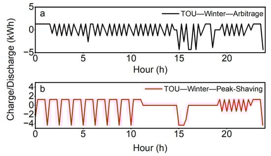 (a) Charge and discharge energy (kWh) for arbitrage against TOU tariff (winter); (b) charge and discharge energy (kWh) for peak shaving against TOU tariff (winter).