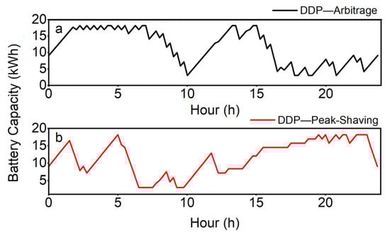 (a) Battery capacity (kWh) for 1 day (15 min interval) for DPP arbitrage; (b) battery capacity (kWh) for 1 day (15 min interval) for DPP peak shaving.