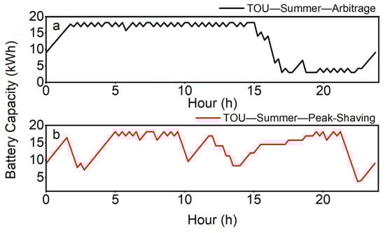 (a) Battery capacity (kWh) for 1 day (15 min interval) for TOU (summer) EA; (b) battery capacity (kWh) for 1 day (15 min interval) for TOU (summer) peak shaving.