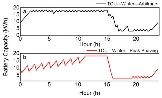 (a) Battery capacity (kWh) for 1 day (15 min interval) for TOU (winter) arbitrage; (b) battery capacity (kWh) for 1 day (15 min interval) for TOU (winter) peak shaving.