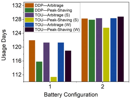 In this part, the usage days of two different operational strategies are investigated. Case 1 simulates the configuration in that the required power is supplied using one LG M50 cell, while case 2 is for the same power supplied using two identical cells. For each case, the battery cell(s) starts from 80% of its original state of health, justifying it as a second-life battery use. It will be terminated at 64%, which is 80% of the starting point of the second-life use. Figure 11 shows the cell life (usage days) calculated for two different configurations. The first configuration considers only one cell providing (discharge) and receiving (charge) energy/power to and from the grid, respectively, against DPP and TOU tariffs for EA and peak shaving. Conversely, the second configuration considers the same for two battery cells. The bar graph shows that cell life is the shortest in the first configuration where the peak shaving is provided by one cell for summer TOU. This is because the cell charges and discharges aggressively for this scenario as compared to the other cases, resulting in heavy cell degradation. The cell life is the longest for the arbitrage case against the DPP tariff. For configuration 2, again the cell life is lowest for peak shaving for TOU (summer), while the cell life is longest for TOU (winter) peak shaving.