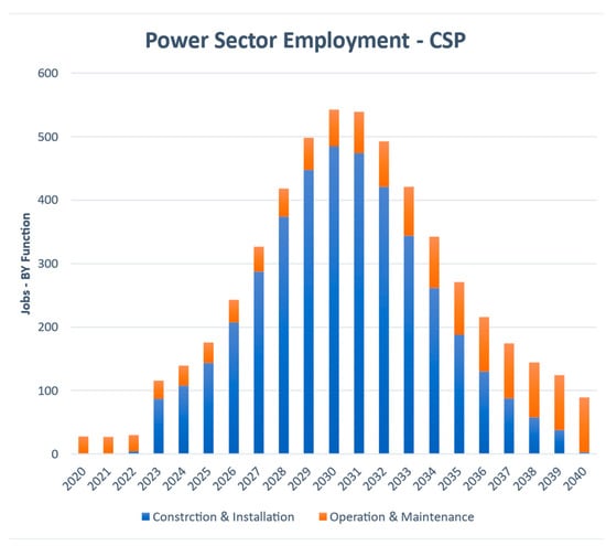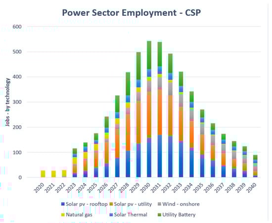 Figure 5 show job creation from 2020 to 2040 for a scenario with CSP. The almost 90 MW from the currently installed electricity system accounts for around 60 jobs based on the assumptions made to calculate the jobs required/created for this type of technology. The figures demonstrate that there is not only a short-term increase in job creation (mainly due to construction) but a long-term increase in operation and maintenance as well. Although the optimizations were run for a “green-field” assumption for 2035, in order to estimate employment, an S-curve interpolation plotted to that date was used as an approximation for the time dependence.