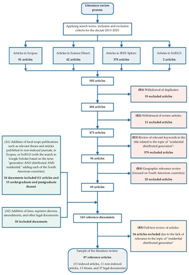 A second search for non-indexed articles and graduate and postgraduate theses was performed to include relevant information from outside of the indexed bases (Addendum, A1, in Figure 1). In the Google Scholar search engine, the temporal filter was applied for 2013–2023, and the search term “generation AND distributed AND residential” was entered, adding the name of each South American country. All PDF files available on the first two pages of each search for each country were extracted. We found 11 scientific articles from journals not indexed in Scopus, SciELO, IEEE Xplore, or Science Direct and 13 graduate theses of relevance to the main topic of this review. It should be noted that the articles considered here as non-indexed can be either non-indexed or indexed in databases such as Latindex, Redalyc, or ROAD.