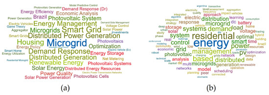 In order to identify the essential general topics covered in these articles, a third review, R3, was applied. With these results, two-word cloud plots were constructed to show those words that appeared in at least ten articles (threshold arbitrarily chosen to achieve clarity in the generated bibliometric layout), constructing (i) a word cloud plot with the keywords of the articles (Figure 2a); and (ii) a relevant word cloud plot of the article titles (Figure 2b). To generate these graphs, the stop words: prepositions, connectors, pronouns, and articles, among others, were eliminated using the base provided in [16]. From this analysis, the most prominent relevant words in the clouds that were thematically linked to residential distributed generation (DG) were considered: residential, distributed, generation, photovoltaic, microgrid, wind, solar, energy policy, demand response, energy efficiency, renewable energy, smart grids, and residential microgrid. The word energy was not considered because it was present in almost all articles evaluated and did not allow for information filtering.