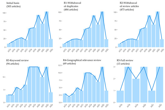 Trend in the number of publications on residential distributed generation for the articles obtained from the databases consulted for the review. The title of each graph indicates the corresponding stage in the flowchart of the literature review (Figure 1) and the number of scientific articles used in each case.
