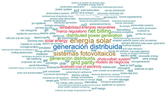 The key areas of interest and focus that researchers and practitioners in the region have explored have been identified through a review of the literature. The percentage of occurrence of keywords in selected papers (n = 37) was reviewed, excluding the 50 legal papers (Table 2, Figure 4). A central theme in the analyzed documents is the growing importance of using photovoltaic energy (78.38%) as the leading source technology for DG (54.05%). In general terms, there is an increasing focus on developing research on renewable energy sources (32.43%).