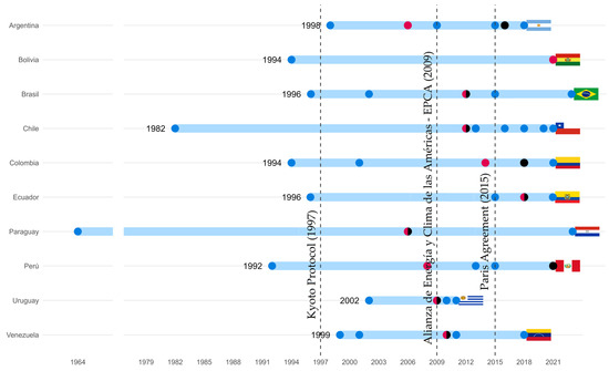 Timeline of energy and electricity legislation in South American countries. The year of the first national regulation per country, the first document on renewable energies (red circle), and the first specific document on distributed generation (black circle) are shown. The blue circles indicate the years in which new regulations appeared or existing regulations were updated. The semicircles indicate that both documents were dated in the same year. The dotted lines indicate key events: Kyoto Protocol (1997), Alianza de Energía y Clima de las Américas-EPCA (2009), and Paris Agreement (2015).