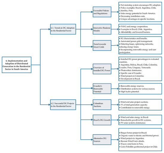 The extracted information was organized to address the topics on DG in the residential sector according to its type; policies and regulatory frameworks; implementation and adoption cases; economic, social, and environmental impact; challenges and barriers; opportunities. This process was carried out after a thorough review of each document considered for this review.