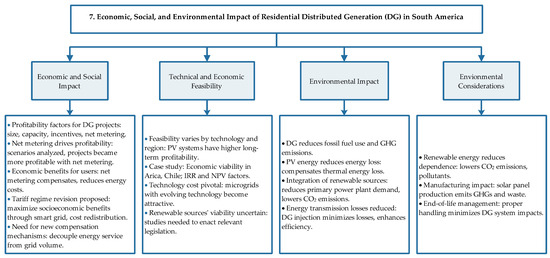 On the other hand, private sector involvement and foreign investment in promoting DG can also boost job creation and economic growth. For example, Germany’s SMA Solar Technology AG, a world leader in solar inverter technology, has invested in production and training facilities in Chile. Its facilities provide a capacity of 137.6 MW, generating employment and knowledge transfer in the region [58]. In addition, public–private partnerships and collaboration between governments and companies can create more favorable regulatory frameworks and promote fiscal incentives, which in turn encourage more significant investment in DG projects in the region [45].