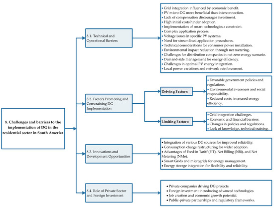 However, there are still challenges facing DG systems in the region, including cost-effectiveness and economics (29.73%) and the need for a stronger regulatory framework [28]. As the levelized cost of electricity (13.51%) continues to decrease and technology advances, DG is likely to further establish itself as a viable and attractive solution for residential energy self-supply in South America [26]. The following sections will detail the findings of the review.