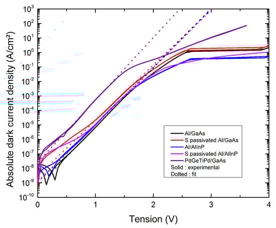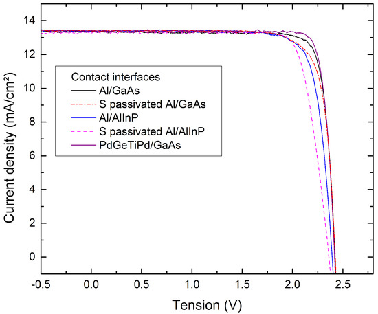 The J–V characteristics of the various solar cells under 1 sun illumination are shown in Figure 4. The short-circuit current density (J), open circuit voltage (V), and fill factor are summarized in Table 1. The flatness of the curves in the low voltage region indicates a high shunt resistance. The J values are in line with expectations for the epitaxial structure considered here. It also shows that the anti-reflection coating design was adequate and that chemical processing, in particular, with the ammonium sulfide solution, did not degrade the top window layer. Solar cells for which Al was deposited on AlInP show a slightly reduced V and fill factor compared to the reference sample with Pd/Ge/Ti/Pd ohmic contacts. They exhibit a high series resistance, which can be seen from the lower slope when approaching V. To the contrary, the fill factor for the samples obtained by deposition of Al on the GaAs contact layer is similar to the reference sample at around 87%. Furthermore, the Al/GaAs interface samples show a slightly higher V by 18–19 mV compared to the reference cell, without and with sulfur passivation. This indicates that passivated contacts are effective in reducing electron-hole recombinations at the metal/semiconductor interface. This result is an indication of the potential of passivated Al contacts to improve III-V multijunction solar cell performances, at least in relatively low light exposure, such as in the case of aerospatial energy systems.