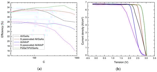 The efficiency as a function of the concentration factor is shown in Figure 6a. For Al/AlInP interfaces, the efficiency is generally lower with a maximum of 28% and only decreases with the concentration factor. This is especially marked when sulfur passivation is performed and results in a very high series resistance. For Al/GaAs interfaces, there is an increase of efficiency with concentration up to 32–33% until around 100 suns, showing a lower series resistance. This is followed by a degradation of efficiency for higher concentration factors. With sulfur treatment, the curve is broader, the degradation is less pronounced, and this sample, therefore, has the lowest series resistance among samples with passivated contacts. However, the reference sample is less impacted by series resistance, with a maximum efficiency around 34.6% at 500 suns. Figure 6b shows the J-V characteristics obtained under a concentration factor of 500 suns. A marked S-shape appears for devices with Al deposited on the AlInP window layer, which degrades the fill factor, explaining the low efficiency. This is a common behavior that is often seen on Si solar cells with metal/dielectric/semiconductor contacts and this appears due to a high Schottky barrier or a dielectric interfacial layer that is too thick [12,16]. It is also more likely to be present for high photogenerated current densities, which explains why it was not seen on the J-V curves at a 1 sun intensity. This behavior is absent when Al is deposited on the GaAs contact layer but the J-V characteristics confirm a higher contact resistance than for the Pd/Ge/Ti/Pd ohmic contacts. However, sulfur passivation at the Al/GaAs interface does reduce resistive losses significantly. Although at this point, the performances under concentrated light of the Al/GaAs contacted solar cells are inferior compared to the reference sample, these results indicate that passivated contacts could potentially be applicable in concentrator systems, especially when combined with the sulfur passivation treatment.