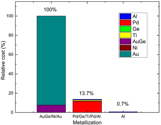 Relative costs of deposited materials for different front contact metallization: AuGe/Ni/Au (200 nm/60 nm/500 nm), Pd/Ge/Ti/Pd/Al (50 nm/100 nm/50 nm/50 nm/1000 nm) and Al (1000 nm).
