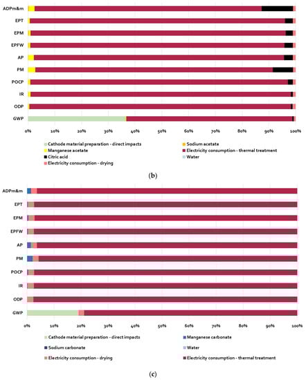 Peters et al. [12] performed one of the first LCA studies on sodium-ion batteries, whereby the authors studied a sodium-ion cell in which the cathodic active material is a layered transition metal oxide (Na1.1Ni0.3Mn0.5Mg0.05Ti0.05O2—NMMT), while the anodic active material is hard carbon, obtained from a carbohydrate (sugar). The cathodic material was prepared with the “solvent casting” method by mixing the active material with a carbon black additive and the polyvinylidene fluoride (PVDF) binder dissolved in N-methyl-2-pyrrolidone (NMP). The anodic material was prepared with the same method by mixing the hard-carbon-based active material with the black-carbon-based additive and the binder, consisting of a mixture of styrene-butadiene copolymer (SBR) and carboxymethylcellulose (CMC) dissolved in water. The current collectors (for both the anode and cathode) were aluminum foils, the electrolyte was sodium hexafluorophosphate salt (NaPF6) dissolved in an organic solvent, and the separator was made of a porous sheet of polyethylene/propylene. Active materials’ manufacturing processes were modeled based on data sheets and patent data, while other cell components and the battery pack were modeled with lithium-ion batteries inventory data, available in the literature. Concerning active materials, production process inputs, in terms of thermal and electrical energy demand, and outputs, in terms pollutants emissions and process waste, were estimated based on stoichiometric considerations or proxy processes. The functional unit was 1 kWh of storage capacity, and the investigated impact categories were the use of fossil resources, climate change, terrestrial acidification, human toxicity, and eutrophication marine and freshwater, assessed through the characterization models implemented by the ReCiPe method [16]. The study showed that cathode and anode preparation processes had significant contributions to all categories examined. In detail, anode production represented 70% of the impact on the eutrophication marine, 30% on climate change and the consumption of fossil resources, and 20% on terrestrial acidification. The cathode was responsible for about 60% of the impact on terrestrial acidification, 20% on climate change, and 16% on terrestrial toxicity.