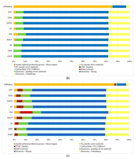 Impact assessment results for 1 Wh of anodic material capacity, broken down into different components/phases of the production process: (a) Sn-NC_PVDF, (b) Sn-NC_CMC, and (c) Sn scenario (GWP: global warming potential, ODP: ozone depletion potential, IR: ionizing radiation, POCP: photochemical ozone formation, PM: particulate matter, AP: acidification, EPFW: eutrophication, freshwater, EPM: eutrophication, marine, EPT: eutrophication, terrestrial, ADPm&m: resource use, minerals and metals).
