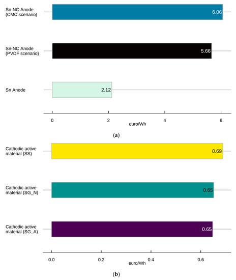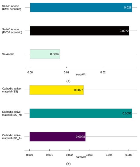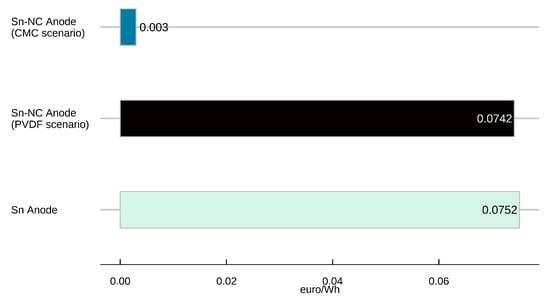 In this case, the Sn-NC_PVDF and the Sn are the elements characterized by the highest indicator values, while the Sn-NC_CMC is the one with the binder and solvent characterized by less resources. The C-LCC indicator calculated for the processes involving the binder and solvent of the latter, in fact, is much lower than that of the other two alternatives.