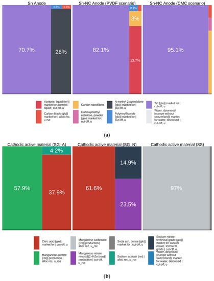 For all considered anode scenarios, the most important process, in terms of resource use, is represented by the active material (in this case, tin); although, in the case of the Sn anode, the solvent also has a not negligible relative weight (approximately 27%). The anodes differ from each other by the binder and solvent used in the production process of the active material.