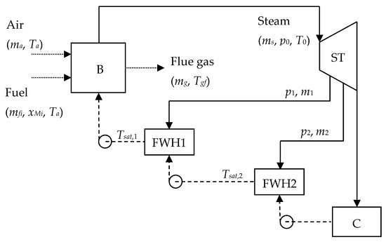 The reference biomass power plant is depicted in Figure 1. The conversion of the chemical energy of fuel to thermal energy in the boiler (B) causes the transformation of feed water to superheated steam. Mechanical power is generated by the steam turbine (ST) as a result of steam expansion. Steam is extracted from the steam turbine at pressures p1 and p2 for the feed water heaters (FWH1 and FWH2). The exhaust steam at pressure p3 becomes saturated feed water after condensation in the condenser (C). The feed water pressure is increased from p3 to p2 by the first pump before the feed water enters FWH2. The feed water is mixed with the extracted steam at pressure p2 in FWH2. The output is sent to the second pump. After the feed water pressure is increased from p2 to p1, the feed water enters FWH1. The feed water is mixed with the extracted steam at pressure p1 in FWH1. The output is sent to the third pump. The feed water pressure is increased from p1 to p0 before the feed water enters the boiler.