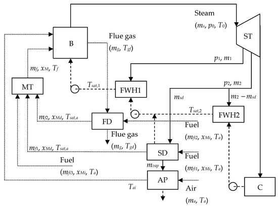 An illustration of the modified power plant is shown in Figure 2. Three additional components in this power plant are a steam dryer (SD), a flue gas dryer (FD), and an air preheater (AP). Steam extracted from a steam turbine at pressure p2 is supplied to FWH2 and SD. The extracted steam flow rate for SD is msd. The extracted steam flow rates result in saturated water at the outlets of the feed water heaters (FWH1 and FWH2). Equation (5) is used to determine m1. Equation (6) for m2 must be changed in the modified power to the following equation: