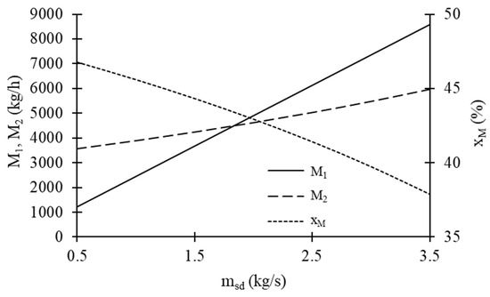 Variations in moisture removal rates in steam and flue gas dryers (M1 and M2) and fuel moisture content at boiler inlet (xM) with extracted steam flow rate in steam dryer (msd).