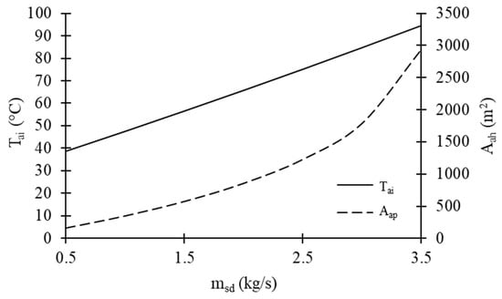 Variations in combustion air temperature at boiler inlet (Tai) and heating surface area of air preheater (Aap) with extracted steam flow rate in steam dryer (msd).