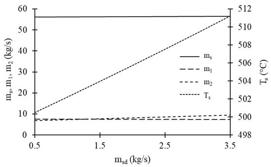 Variations in steam flow rate (ms), extracted steam flow rates (m1 and m2), and steam temperature (Ts) with extracted steam flow rate in steam dryer (msd).
