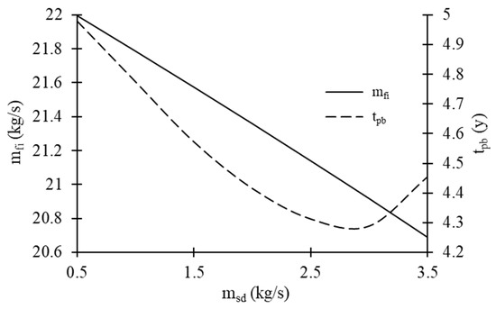 Variations in fuel consumption rate (mfi) and payback period (tpb) with extracted steam flow rate in steam dryer (msd).
