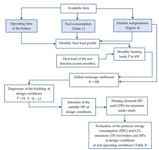 Regarding (1), it was necessary to know the thermal demand of the industrial process and the dispersion of the building (under design conditions). The latter conditions are not known (envelope transmittance and surfaces are not known). They are therefore derived from fuel consumption and outside air temperatures. This procedure is better detailed in the flowchart of Figure 1.