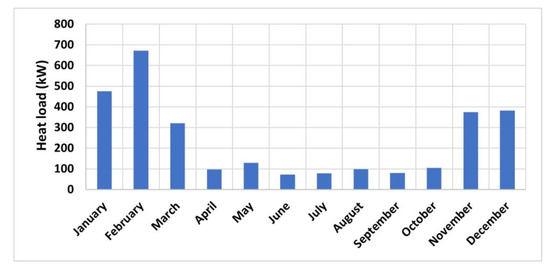 Finally, the heat consumption for each month was divided by the monthly operating hours to obtain the monthly heat load in kW. The results are shown in Figure 3.