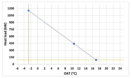 A similar result can be obtained using the graphical method of the simplified energy signature [20], which relates the heat load in kW to the outside air temperature (OAT) in °C. Specifically, a line is drawn from two specific points and any value of heat load can be obtained. The points are the following.
