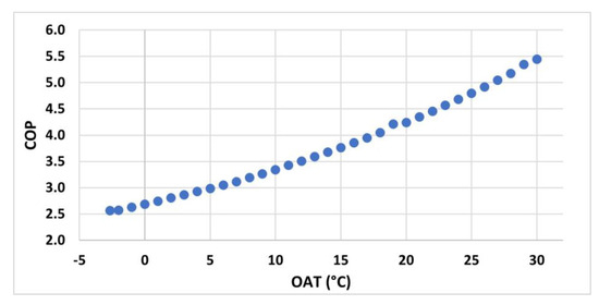 The data provided by the HP manufacturer’s selection software, available on the web as a selection tool, were used to describe the performance of the HPs at partial loads and specific outdoor air temperatures. In particular, for each month, once the leaving water temperature (LWT) was set at 50 °C and the required thermal power in kW and the outside air temperature (OAT) were known, the Coefficient of Performance (COP) and the absorbed electrical power input (PI) in kW were obtained. The characteristics of the selected HP operating at 50 °C are shown in Figure 6 and Figure 7. Specifically, Figure 6 shows the COP as a function of the outside air temperature (OAT), and Figure 7 shows the COP behaviour in different load conditions according to UNI EN 14825 [23].