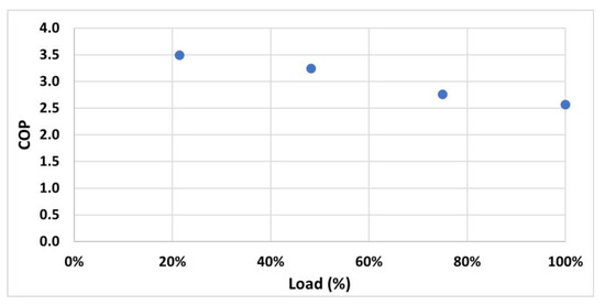 COP trend in relation to heat load [%] for an outlet water temperature of 50 °C, following UNI EN 14825 [23].