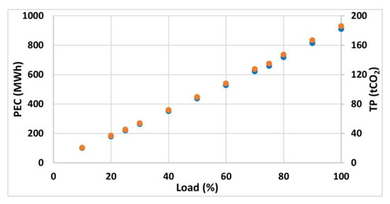 Primary energy consumption (PEC) in blue and tons of CO2 produced (TP) in orange as a function of load (%) for a fixed OAT of 7 °C and LWT of 50 °C.